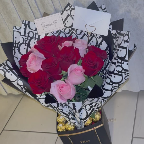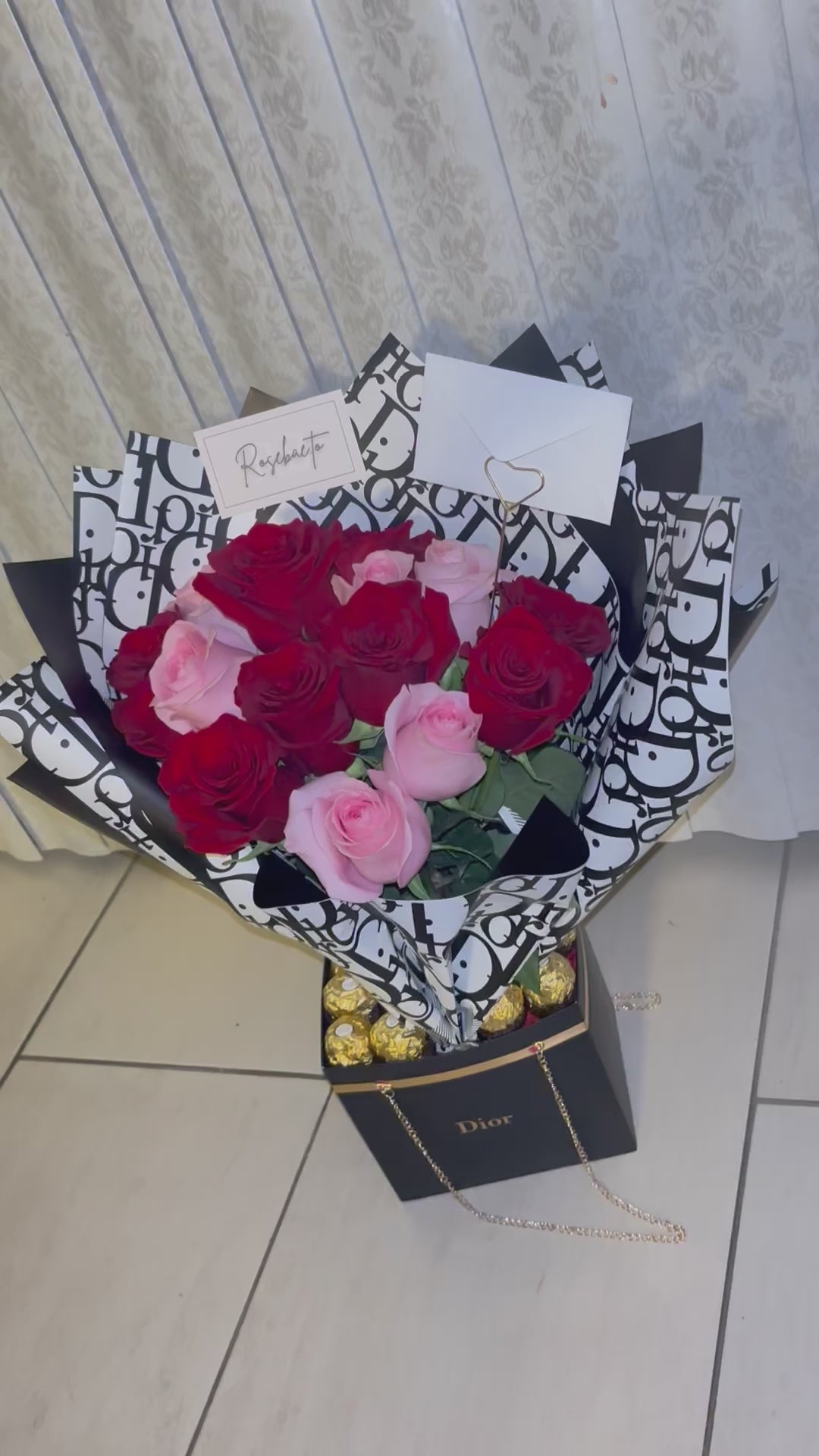 This beautiful bouquet features fresh, long stem roses beautifully arranged in a glass vase. We also add an extra touch of luxury by wrapping the vase in premium Dior paper, and placing it in a Dior box!