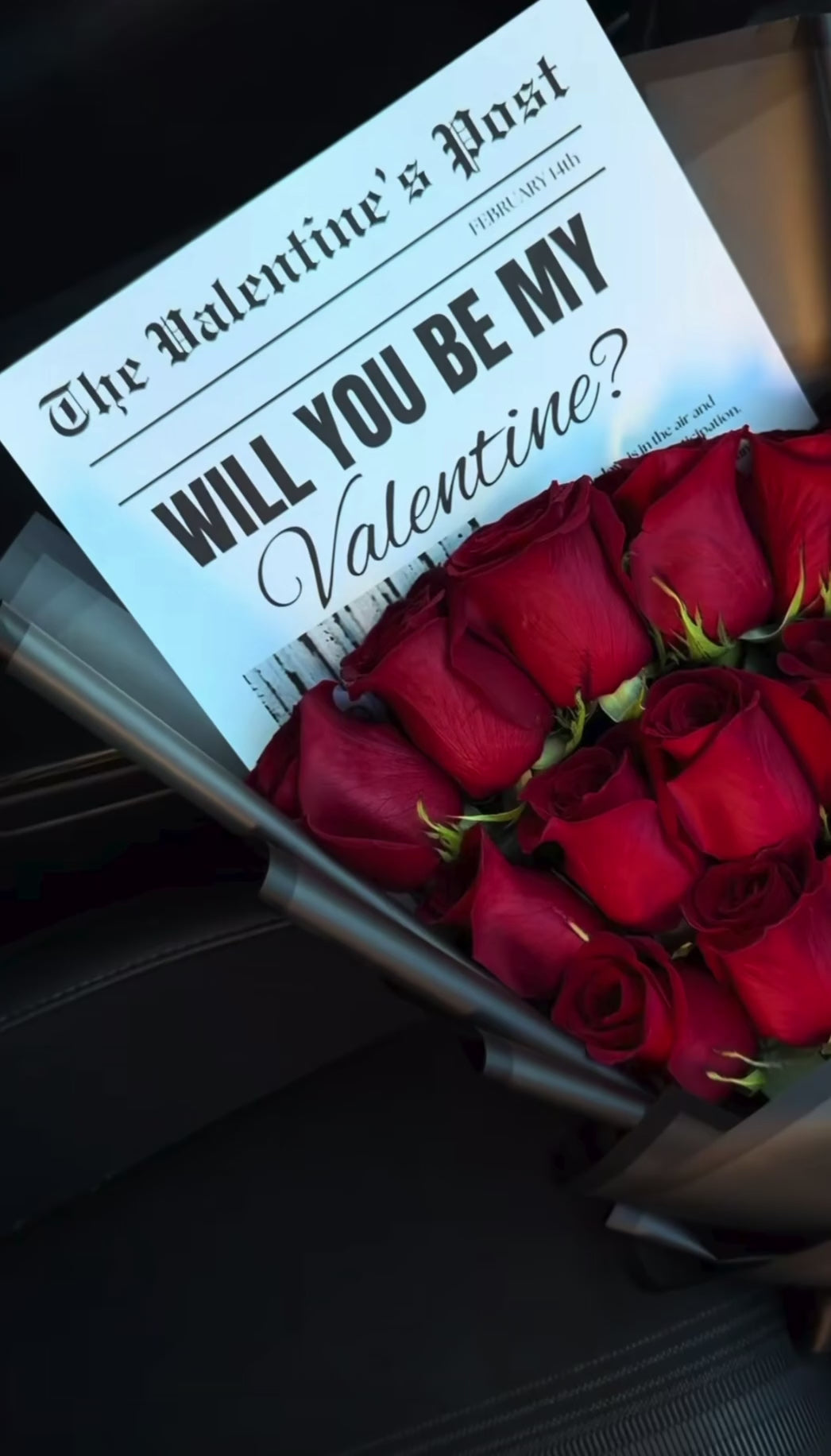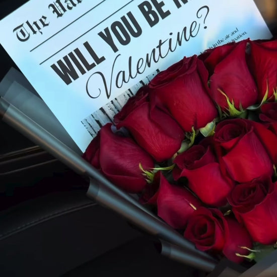 A beautiful bouquet of a dozen roses with a personalized “Will You Be My Valentine’s” newspaper. Ask her to be your Valentine’s this year with a special arrangement made of fresh, premium roses!